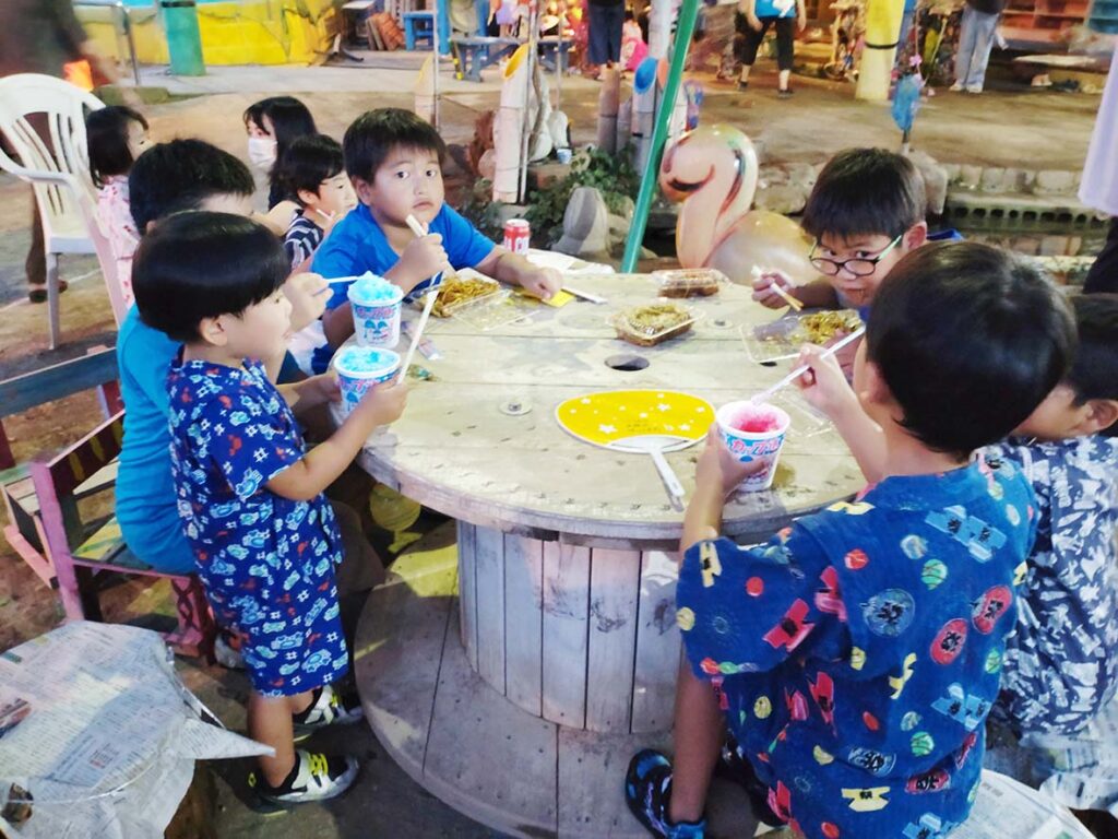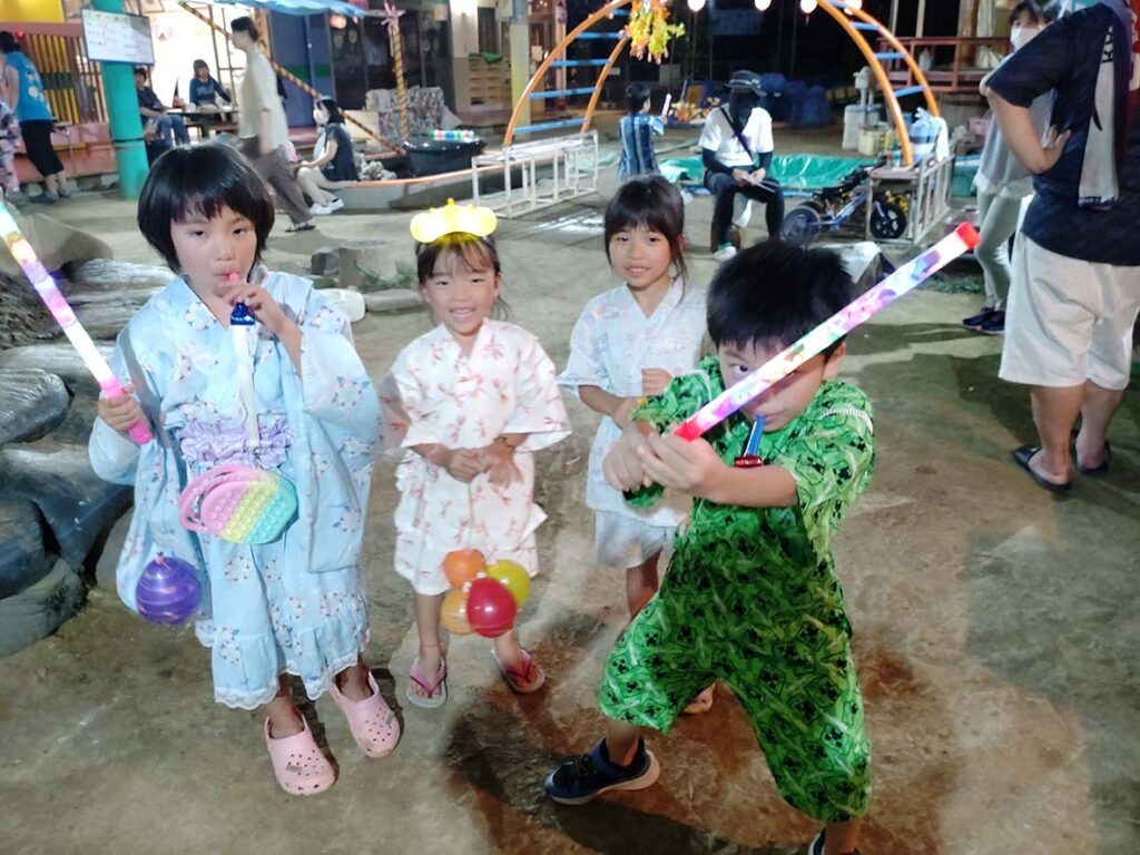 夕涼み会(バザー) 2023年8月8日 7月28日、4年ぶりにバザーを開催しました。初めての子どもたちがほとんどで、浴衣や甚平に着替えた子どもたちは、ワクワクが止まらない様子でお友だちと嬉しそうにはしゃぐ声が聞こえていました。虫歯ゼロ表彰に始まり、踊りを踊った後バザー開始。焼きそば・から揚げ・カレー・かき氷・飲み物・おもちゃ・ヨーヨーの屋台をチケット片手にまわっていました。猛暑の中子どもたちの笑顔のために汗を流し頑張って頂きありがとうございました。