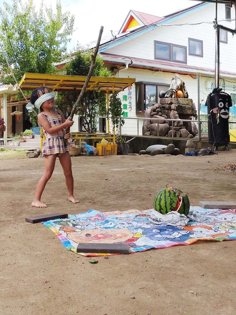 キャンプでする予定だったスイカ割をみんなで楽しみました。右右!左左!前々!とギャラリーの声とスイカが割れた時の歓声が園庭に響き渡りました。